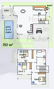 Land: 352 m². House: 200 m²1 year: 75.000 THB (6m: 85.000 THB)